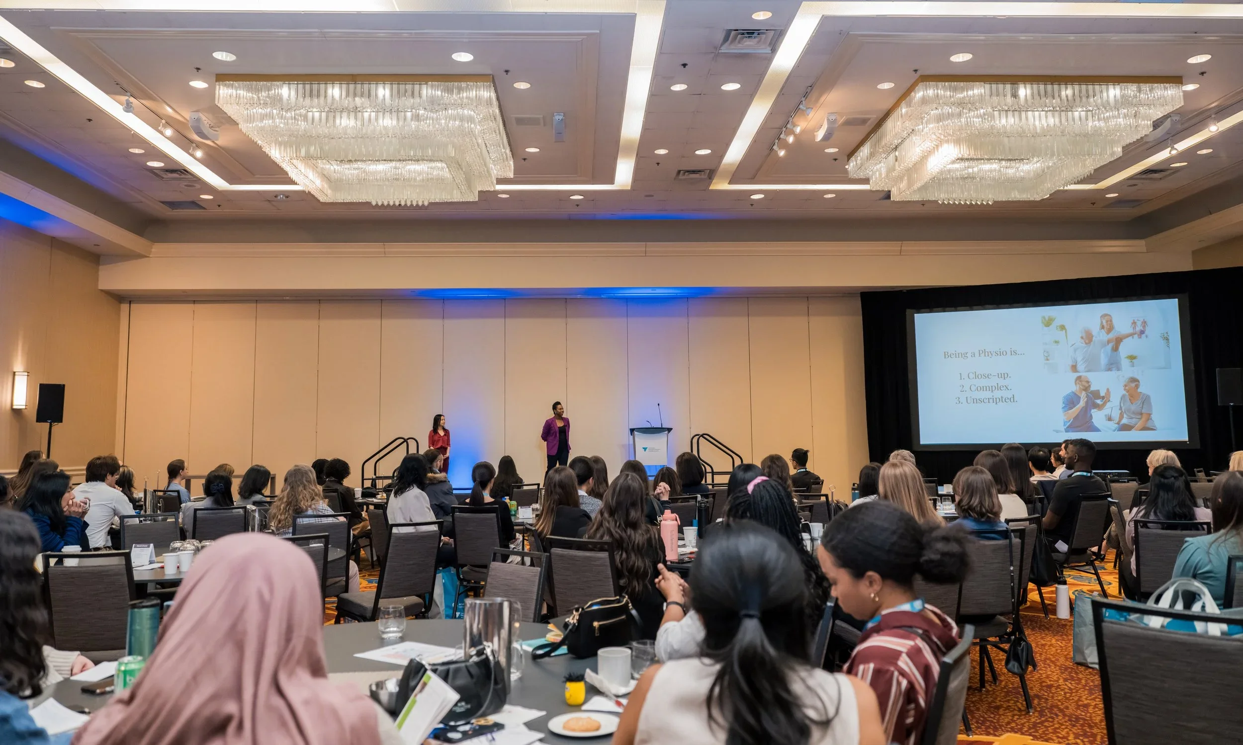 Anna and Andrea present their keynote talk at the Ontario Physiotherapy Association Interaction Conference in March 2025. Our slide reads: “Being a physio is: close-up, complex, and unscripted”.